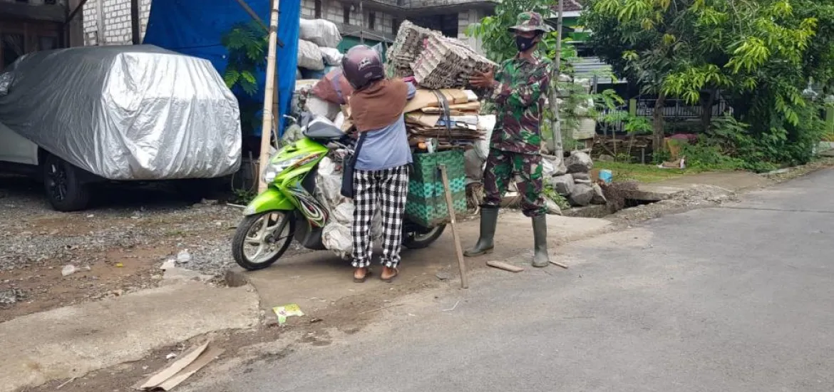 Seperti yang dilakukan Serda Fajarianto salah satu anggota Satgas TMMD Reguler ke-111 Kodim Pati yang meluangkan waktunya disela-sela kesibukannya untuk membantu Harti (45) warga Dukuh Kalimati, Desa Tamansari, Kecamatan Jaken, Kabupaten Pati, menurunkan barang bekas yang diangkutnya dari atas sepeda motor. Ia berprofesi jual beli barang bekas atau biasa disebut rongsok yaitu dengan membeli dari warga masyarakat dan di jual kembali ke pengepul barang bekas, Rabu (07/7/2021).