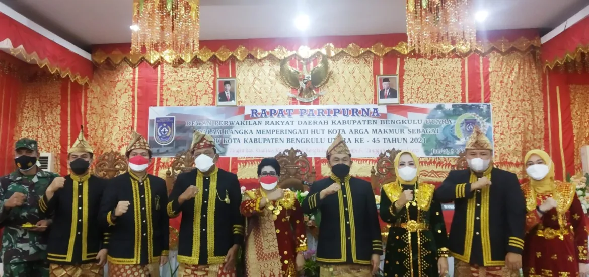 SiberZone.id, Bengkulu Utara - Dewan Perwakilan Rakyat Daerah (DPRD) Kabupaten Bengkulu Utara (BU) menggelar sidang paripurna istimewa dalam rangka memperingati HUT Kota Arga Makmur sebagai ibukota Kabupaten Bengkulu Utara ke-45 tahun 2021, Jumat (08/10/2021) bertempat di ruang rapat paripurna DPRD BU. Acara ini dengan tetap mematuhi protocol kesehatan dan menggunakan pakaian adat meskipun ruang sidang DPRD BU tidak dihiasi berbagai macam hiasan adat.