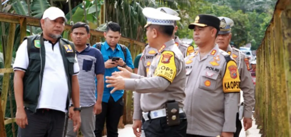 Siberzone.id - Direktur Lalu Lintas Polda Riau Kombes Pol Taufiq Lukman Nurhidayat bersama Dinas PUPR Provinsi Riau meninjau langsung kondisi Jembatan Sungai Rokan di Kecamatan Ujung Batu, Kabupaten Rokan Hulu, yang mengalami kemiringan signifikan akibat terkikisnya pondasi jembatan oleh arus sungai.