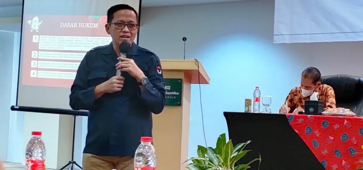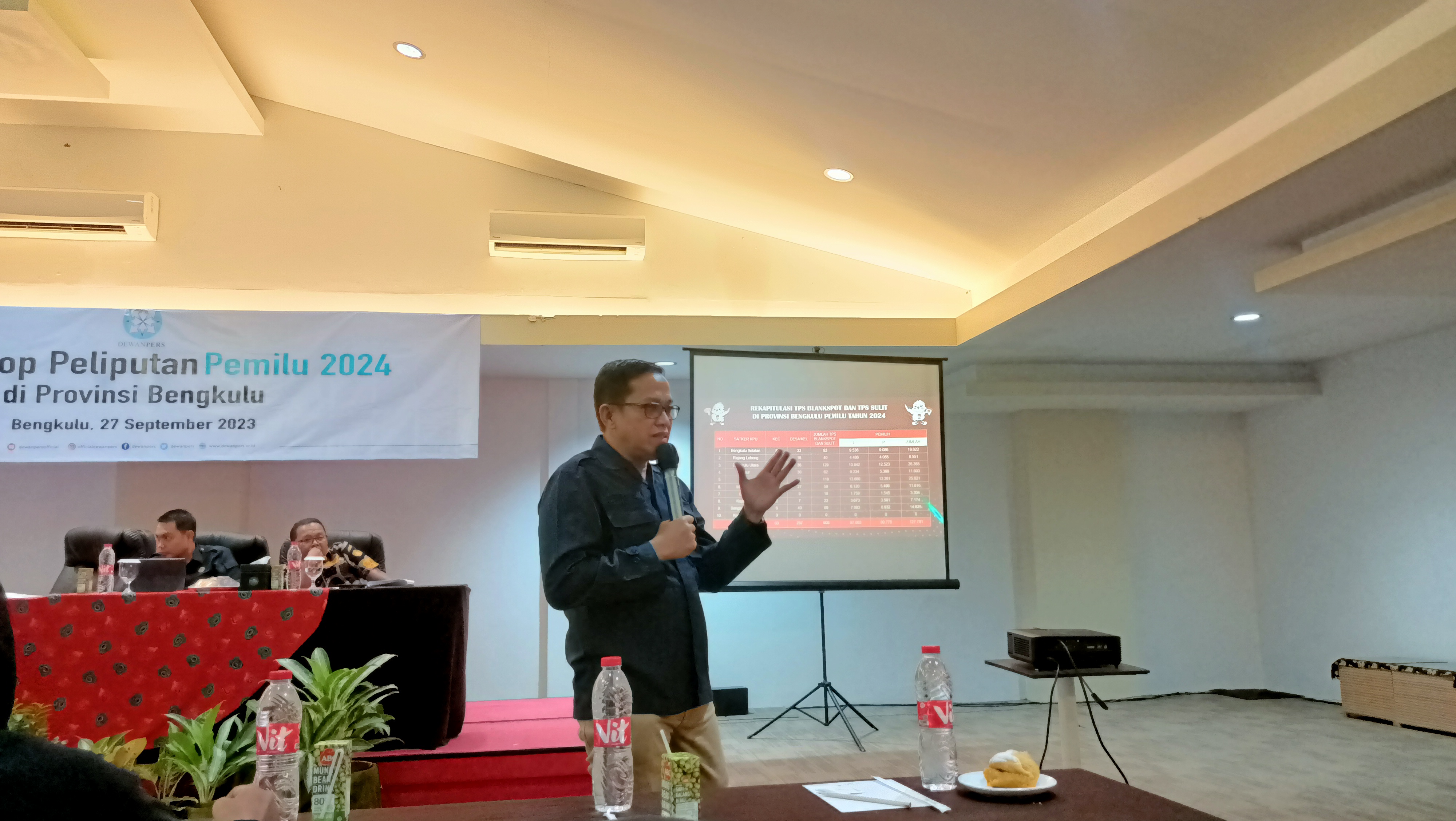 Komisioner KPU Provinsi Bengkulu Emex Verzoni, SE yang menyampaikan materi beberapa jadwal tahapan pemilu 2024 termasuk jumlah beberapa Tempat Pemungutan Suara (TPS) yang ada di seluruh provinsi Bengkulu.
