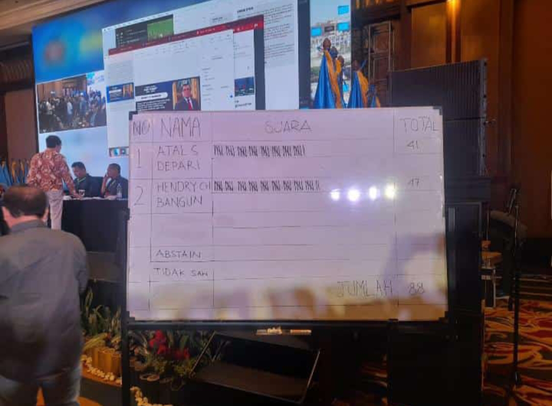 Dari hasil penghitungan suara, dari tiga calon, ada dua calon yang mendapatkan suara terbesar yaitu Atal Sembiring Depari dan Hendry Ch Bangun. Sesuai dengan yang telah disepakati nanti akan ada pemilihan putaran kedua,” kata pimpinan sidang Lutfil Hakim.
