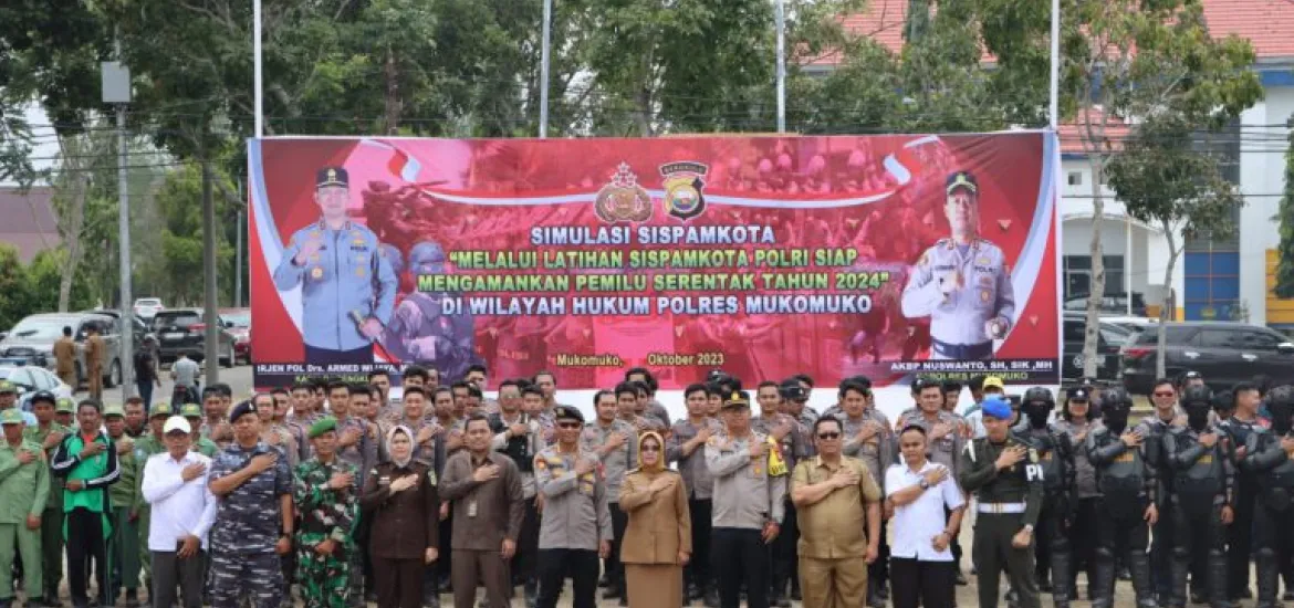 SiberZone.id - Polres Mukomuko menerapkan sistem simulasi sispamkota sesuai dengan kondisi di lapangan untuk menciptakan suasana kesiapsiagaan Pemilu 2024 dengan kolaborasi TNI, Polri, Pemda, KPU dan Bawaslu Mukomuko.