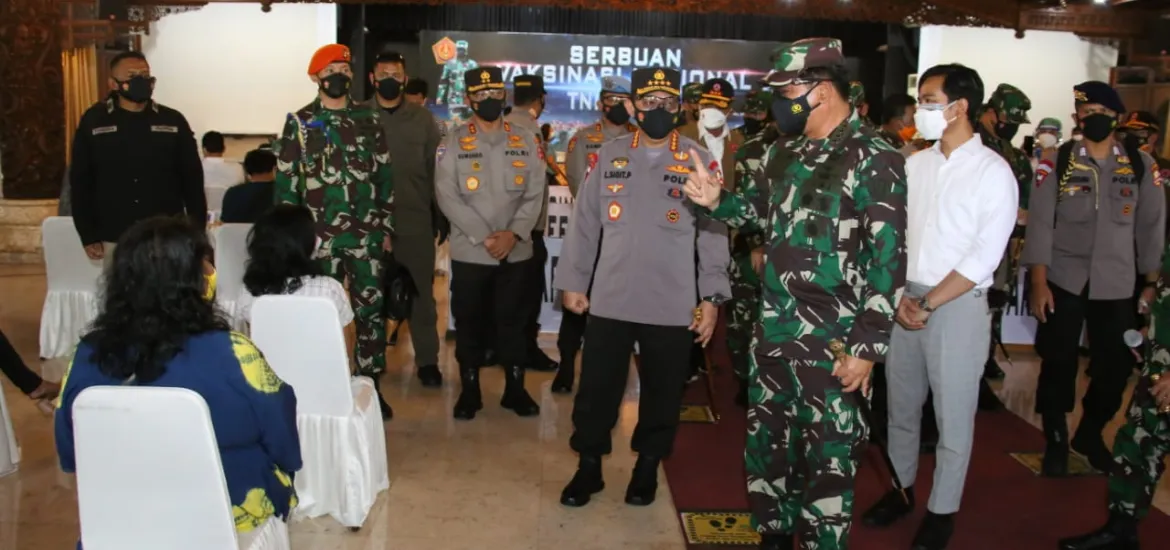 Siberzone.id, Solo — Panglima TNI Marsekal Hadi Tjahjanto bersama Kapolri Jenderal Polisi Listyo Sigit Prabowo meninjau serbuan vaksinasi di Solo, Jawa Tengah, Jumat 9 Juli 2021. Lokasi pertama yang disambangi Gedung Perkumpulan Masyarakat Solo (PMS) dan yang kedua Gedung Wanita Sarana Krida Kusuma.
