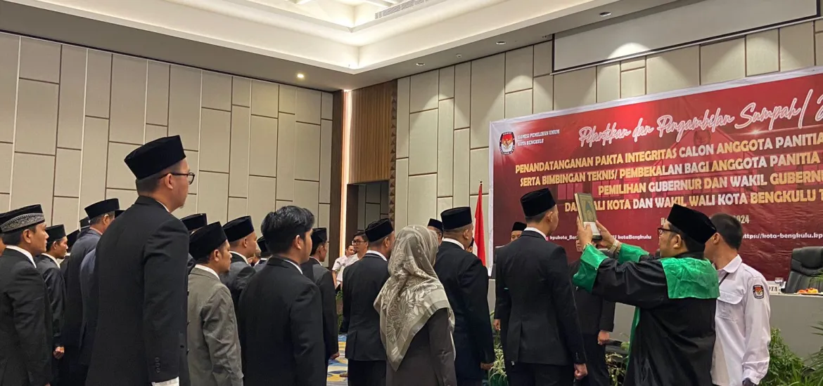 Siberzone.id - Komisi Pemilihan Umum (KPU) Kota Bengkulu gelar Pelantikan dan Pengambilan Sumpah/Janji Penandatangan Pakta Intergritas Calon Anggota Panitia Pemilihan Kecamatan (PPK) serta Bimbingan Teknis/Pembekalan Bagi Anggota Panitia Pemilihan Kecamatan Pemilihan Gubernur dan Wakil Gubernur, Walikota dan Wakil Walikota di Hotel Mercure, Kamis (16/05/2024).