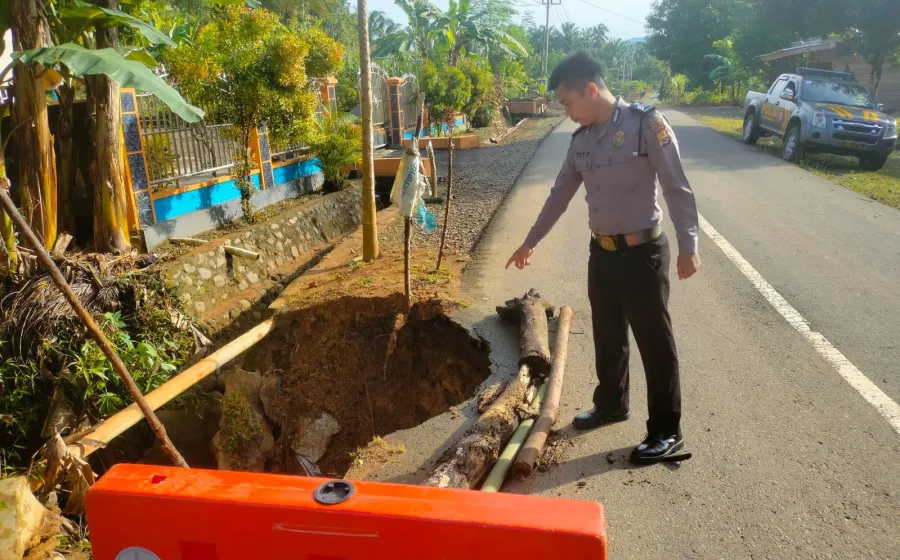 Polsek Giri Mulya Lakukan Pemasangan Barier di Jalan Amblas Sebagai Tanda Peringatan