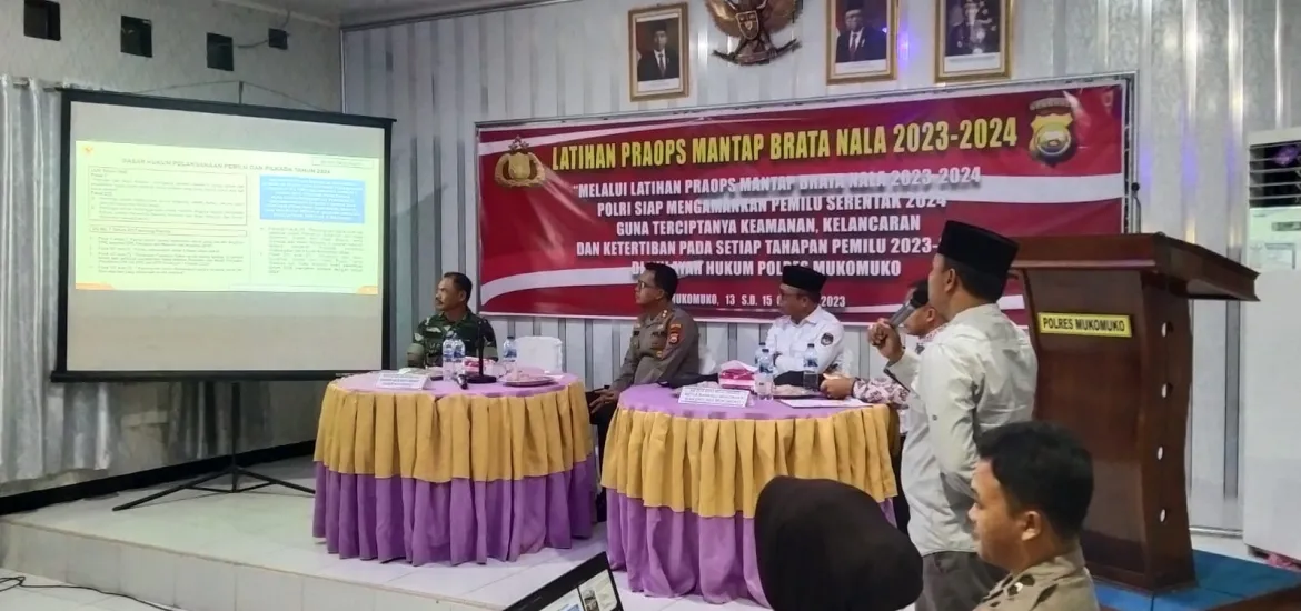 Siberzone.id - Polres Mukomuko menggelar latihan pra operasi (Latpraops) Mantap Brata 2023-2024 dalam rangka kesiapan pengamanan Pemilu serentak mendatang.