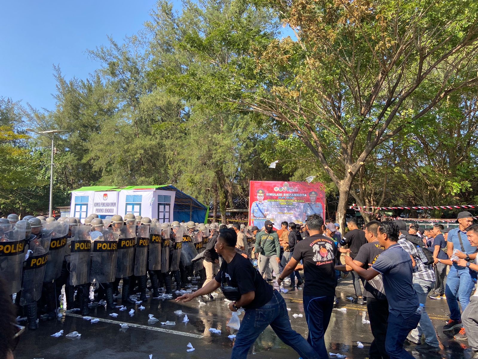 "Hari ini kita melaksanakan Simulasi Sispamkota untuk pengaman dalam menghadapi pelaksanaan Pemilukada di seluruh Provinsi Bengkulu. Ada beberapa kegiatan atau adegan yang dilaksanakan di antaranya simulasi pencoblosan surat suara, aksi-aksi gangguan, baik ringan sampai berat, dan tindakan-tindakan pengamanan, dari negosiasi sampai tindakan tegas," ucap Kapolda Bengkulu, Brigjen Pol Anwar S.I.K., M.Si., Rabu (14/08/2024).