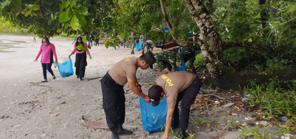 Polsek Enggano bersama Koramil Enggano Laksanakan Aksi Bersih Pantai dalam Rangka Hut Bhayangkara Ke 77