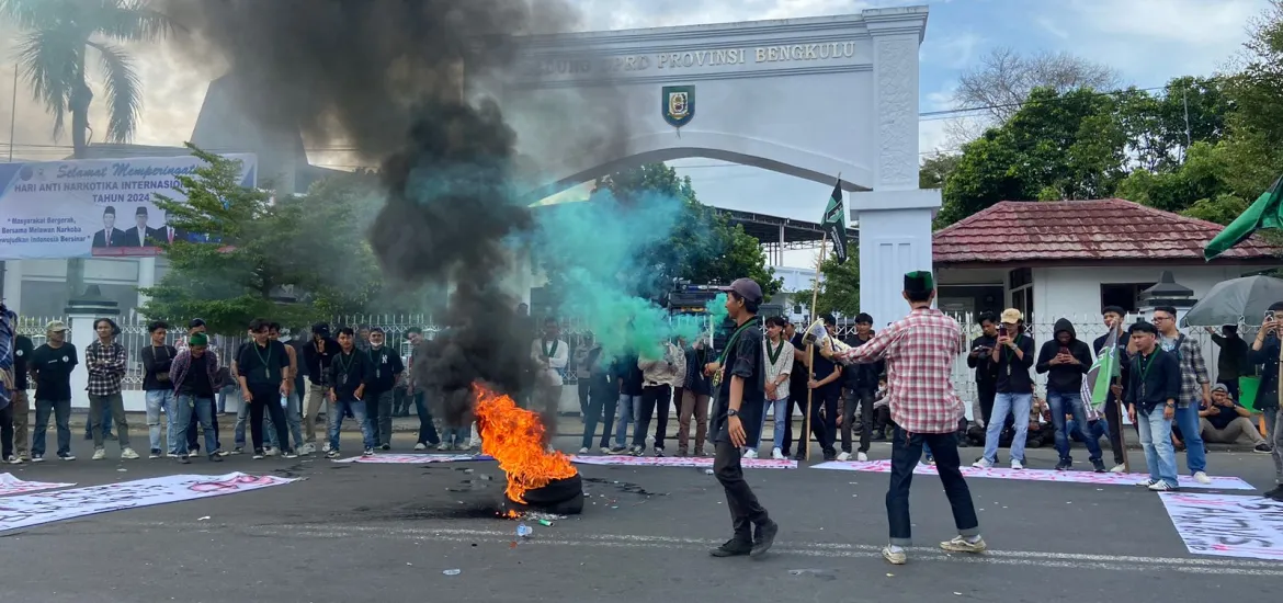 Siberzone.id - Ratusan Himpunan Mahasiswa Indonesia (HMI) Cabang Bengkulu gelar aksi Stop Kriminalisasi Aktivis, Stop Komersial Pendidikan, Tolak Tapera, Tolak RUU TNI-Polri, dam Tolak RUU Penyiaran di Depan Gedung DPRD Provinsi Bengkulu, Selasa (25/06/2024).