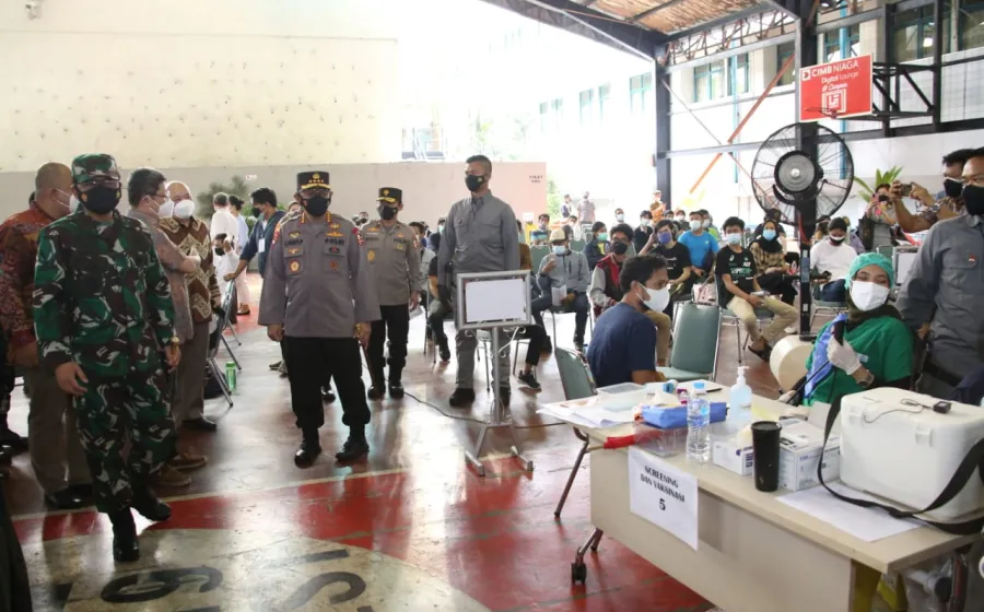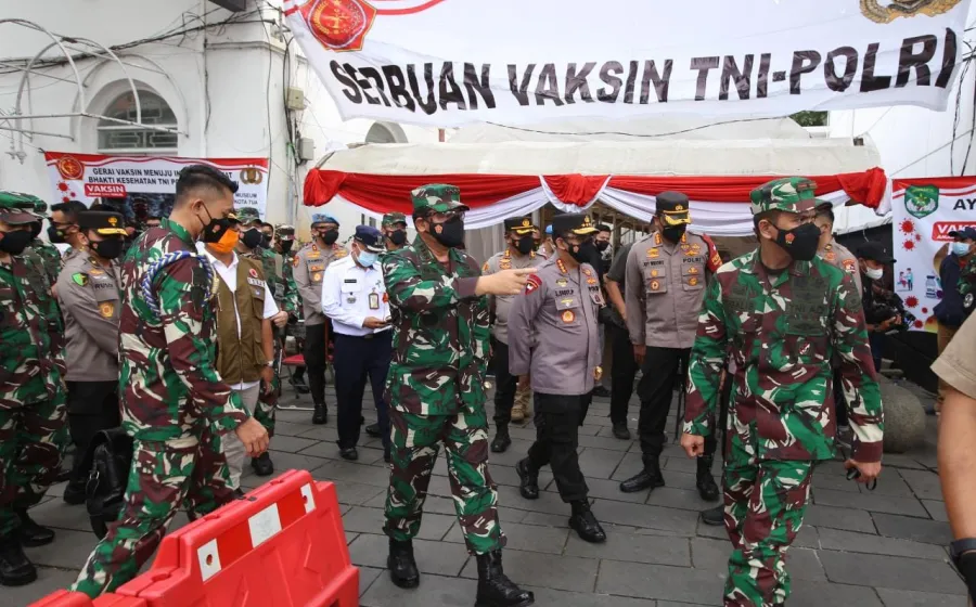Foto : Panglima TNI Marsekal Hadi Tjahjanto dan Kapolri Jenderal Listyo Sigit Prabowo meninjau vaksinasi massal di Ko