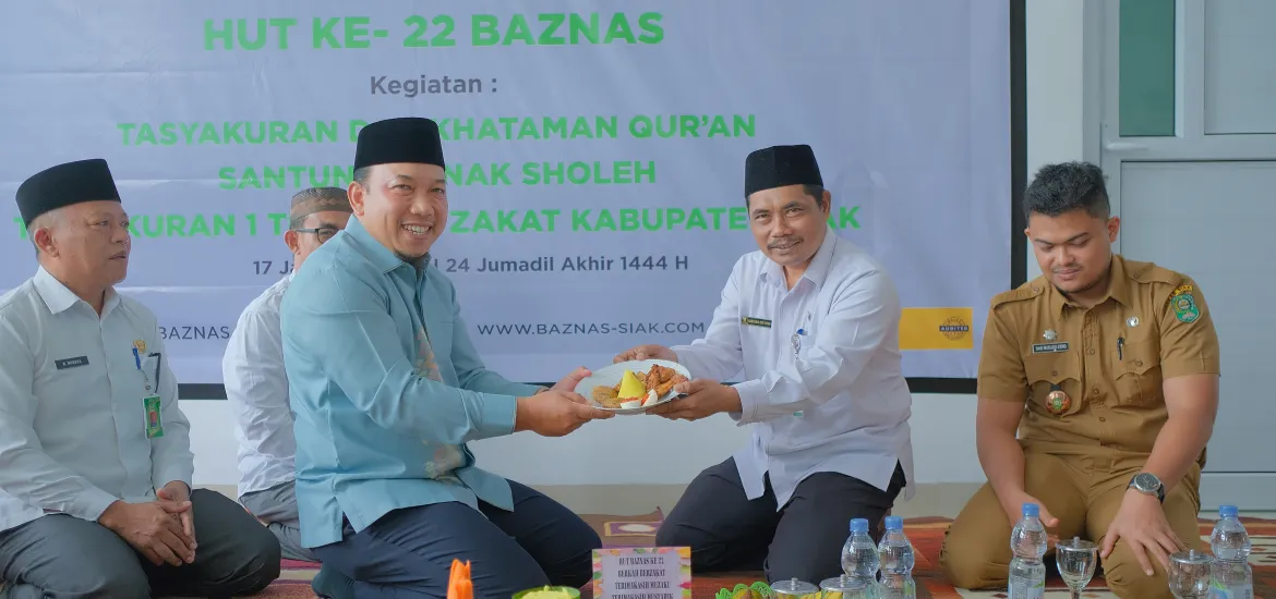 SiberZone.id - Memperingati Hari Ulang Tahun (HUT) Badan Amil Zakat Nasional (Baznas) ke-22, Baznas Kabupaten Siak menggelar Tasyakuran dan Khataman Qur'an, Santunan Anak Sholeh, serta Tasyakuran 1 Tahun Graha Zakat Kabupaten Siak, di Kantor Baznas Siak, Selasa (17/1/2023).