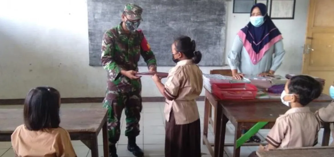 Dialah Serda Irwanto, terlihat sedang membantu guru Sekolah Dasar yang membagikan raport untuk kenaikan kelas Tahun Ajaran 2020/2021. Menurutnya, kegiatan ini dilakukan selain memantau kegiatan pembagian raport, juga menghimbau kepada murid-murid untuk tetap mematuhi protokol kesehatan Covid-19 dalam kegiatan tersebut. Selain itu, kegiatan ini juga sebagai ajang komunikasi sosial dengan warga masyarakat setempat.