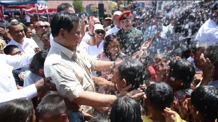 Kebahagiaan Prabowo ditunjukkannya dengan ikut bermain air bersama anak-anak di sumber titik air di Dusun Upunyor. Anak-anak yang sudah sedari tadi bermain di bawah pancuran air langsung memeluk Prabowo.