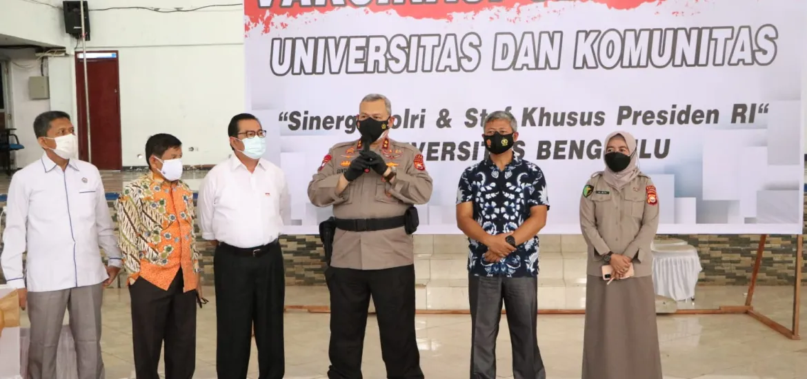 Kapolda Bengkulu yang didampingi Pejabat Utama bersama Rektor Unib Prof. Dr. Ridwan Nurazi, SE, M.Sc, Ak, dalam kesempatan ini memberikan apresiasi dan ucapan terimakasih atas partisipasi peserta vaksinasi yang kebanyakan merupakan para mahasiswa serta pihak Universitas yang mendukung penuh kegiatan.