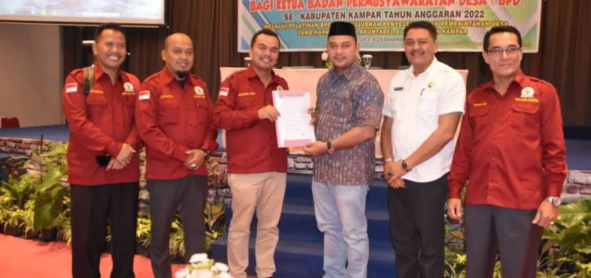 Hal itu ditegaskan Faisal menanggapi pernyataan sikap/rekomendasi Forum BPD Kabupaten Kampar Peserta Bimtek BPD Yogyakarta 10-13 Desember 2022 dan Bimtek BPD Pekanbaru 14-15 Desember 2022 yang dibacakan oleh pengurus Forum BPD Kabupaten Kampar periode 2021-2023 H Muaslam pada kegiatan Pelatihan Peningkatan Kapasitas Anggota BPD se-Kabupaten Kampar Tahun Anggaran 2022 yang diikuti 120 orang ketua/anggota BPD se-Kabupaten Kampar di Hotel Mona, Pekanbaru, Rabu (14/12/2022).