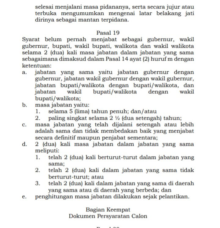 Syarat belum pernah menjabat sebagai gubernur, wakil gubernur, bupati, wakil bupati, walikota dan wakil walikota selama 2 (dua) kali masa jabatan dalam jabatan yang sama sebagaimana dimaksud dalam Pasal 14 ayat (2) huruf m dengan ketentuan: